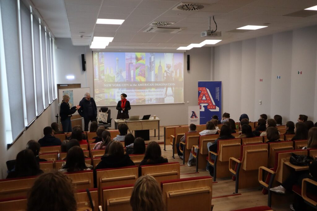 Uczniowie klas pierwszych mieli okazję uczestniczyć w wykładzie w Instytucie Amerykanistyki i Studiów Polonijnych UJ. Tematem wystąpienia był Nowy Jork widziany z perspektywy kultury (’New York in the American Imagination’). Pierwszoklasiści poznali słynne miasto z perspektywy filmów, seriali, dzieł kultury oraz nowoczesnych i nietypowych pomysłów kulinarnych takich jak cronut. Uczestnictwo w wykładzie było cennym doświadczeniem oraz możliwością nauki języka angielskiego w nieco innej odsłonie.