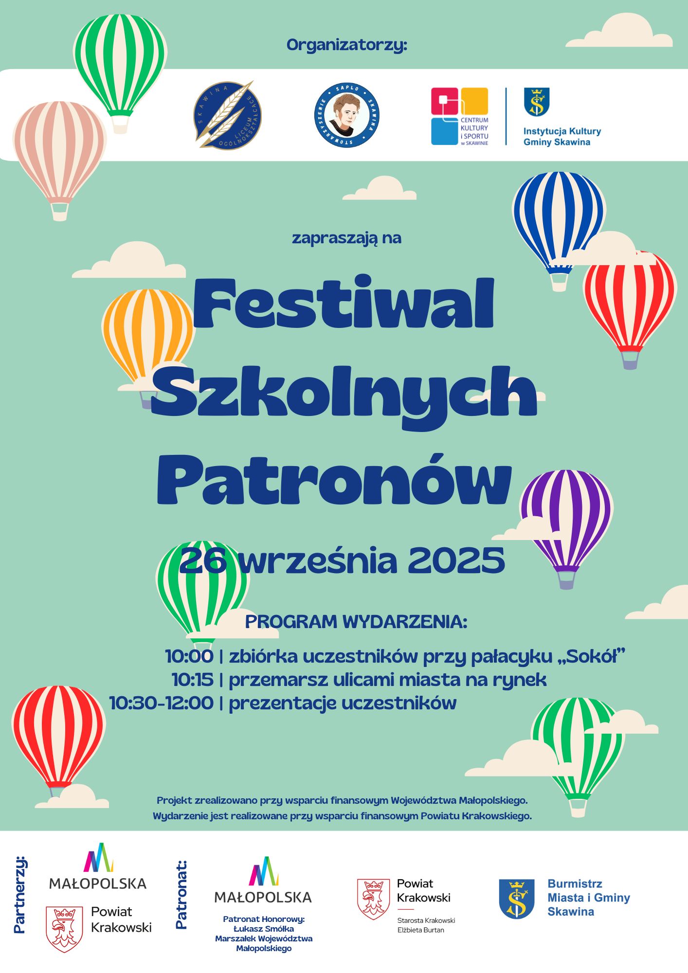 W piątkowe, nieco chłodne, ale słoneczne przedpołudnie uwagę mieszkańców Skawiny przyciągnął wielobarwny korowód niezwykłych postaci maszerujących w rytm skocznych piosenek wygrywanych przez Orkiestrę „Sygnał” z Radziszowa. A wśród postaci znaleźli się i wielcy naukowcy i badacze kultury, i postacie z bajek, literaci, działacze społeczni, a nawet …dwóch papieży! Skąd taka ich różnorodność? To patroni szkół, które wzięły udział w Festiwalu Szkolnych Patronów, wydarzeniu organizowanemu przez Stowarzyszenie Absolwentów i Przyjaciół Liceum Ogólnokształcącego oraz Liceum Ogólnokształcące we współpracy z Centrum Kultury i Sportu w Skawinie.