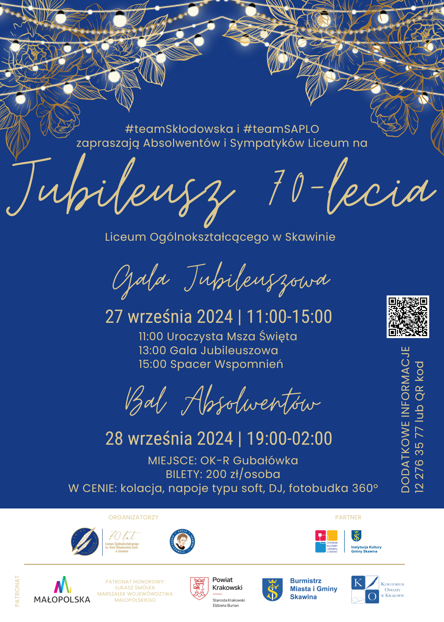 Na uroczystość zapraszają Liceum Ogólnokształcące im. M. Skłodowskiej- Curie w Skawinie, Stowarzyszenie Absolwentów i Przyjaciół LO, Dyrekcja, i, jako partner wydarzenia, Centrum Kultury i Sportu w Skawinie.