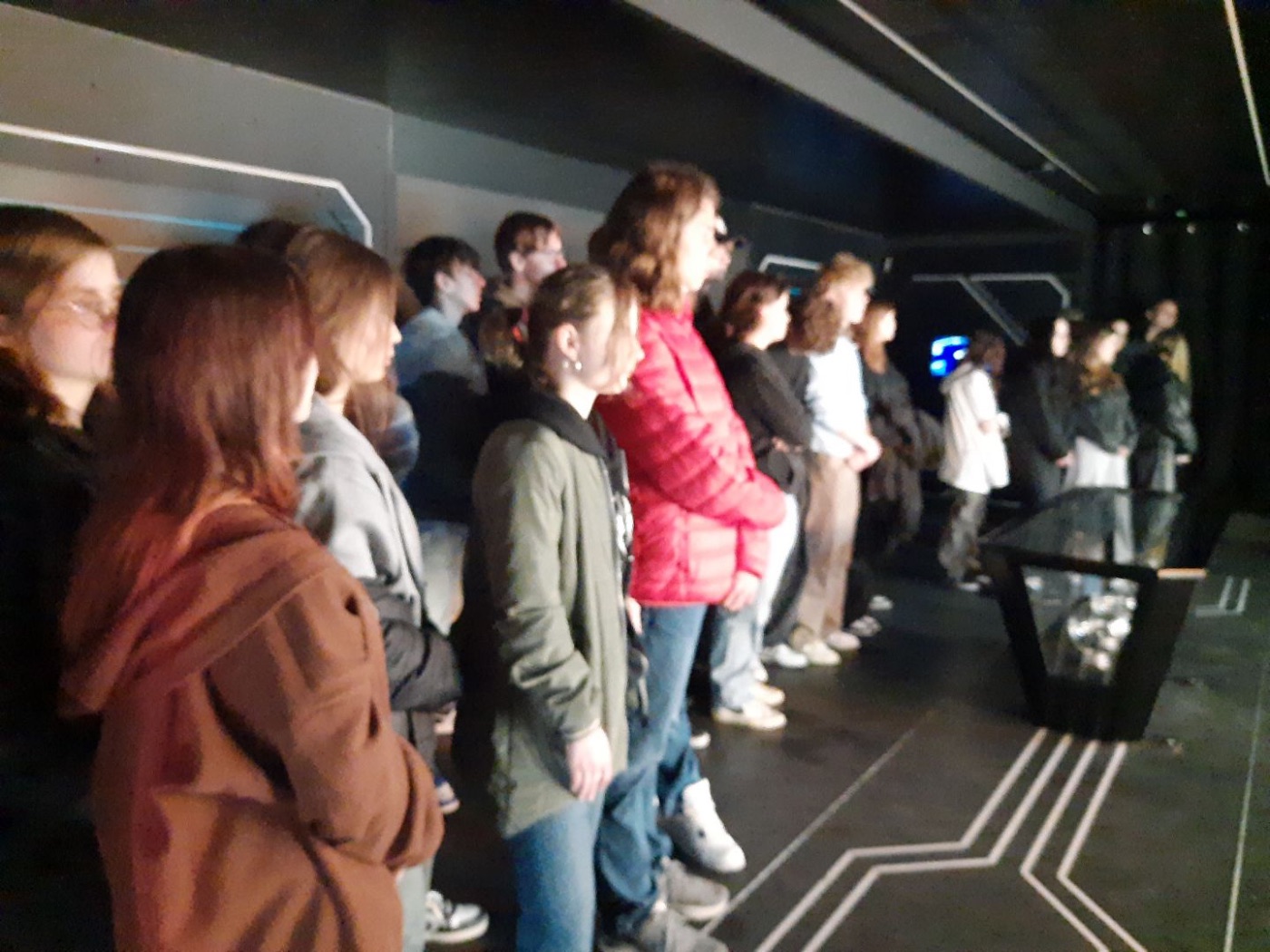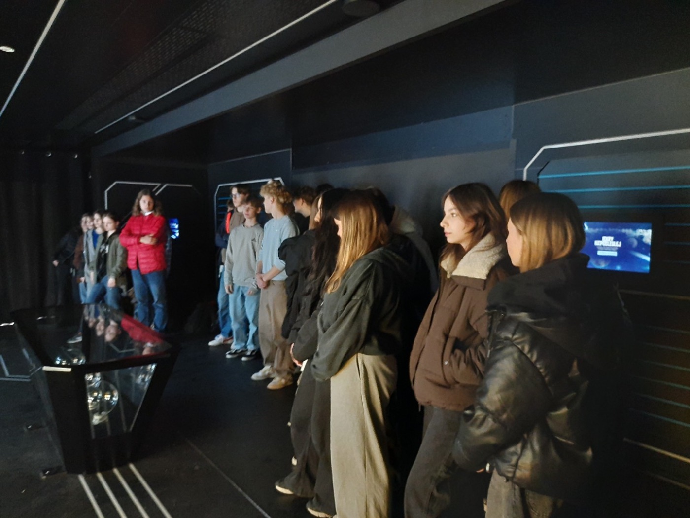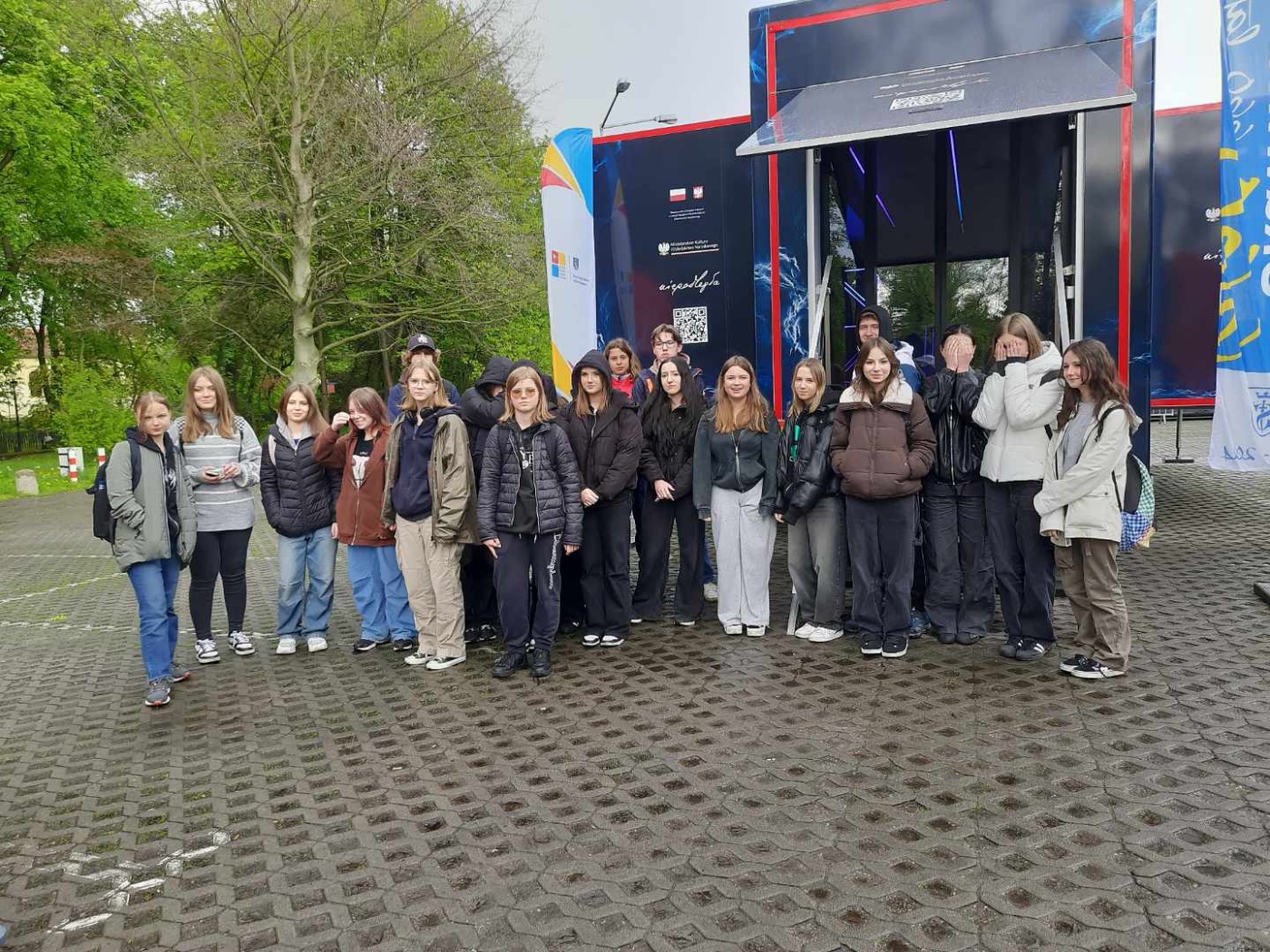 Uczniowie wraz z wychowawcą przeszli ze szkoły na parking przy Parku Miejskim w Skawinie. Czekał tam na nich ogromny tir „Niepodległej” – specjalna naczepa podróżująca po całej Polsce. Klasa obejrzała wyjątkową wystawę multimedialną w ramach immersyjnego pokazu o wybitnych Polkach i Polakach, którzy zmienili świat. Zastosowanie unikalnych rozwiązań technologicznych pozostawiło niezapomniane wrażenia. Technologia połączona z faktami i postaciami historycznymi, stworzyła opowieść o niepodległości Polski. Uczestnicy wycieczki poznali bohaterów tworzących naszą codzienność w różnych dziedzinach. Opowieść o niepodległości Polski przedstawia postać wykreowana przez AI i poruszająca się po ścianie na specjalnym ekranie.