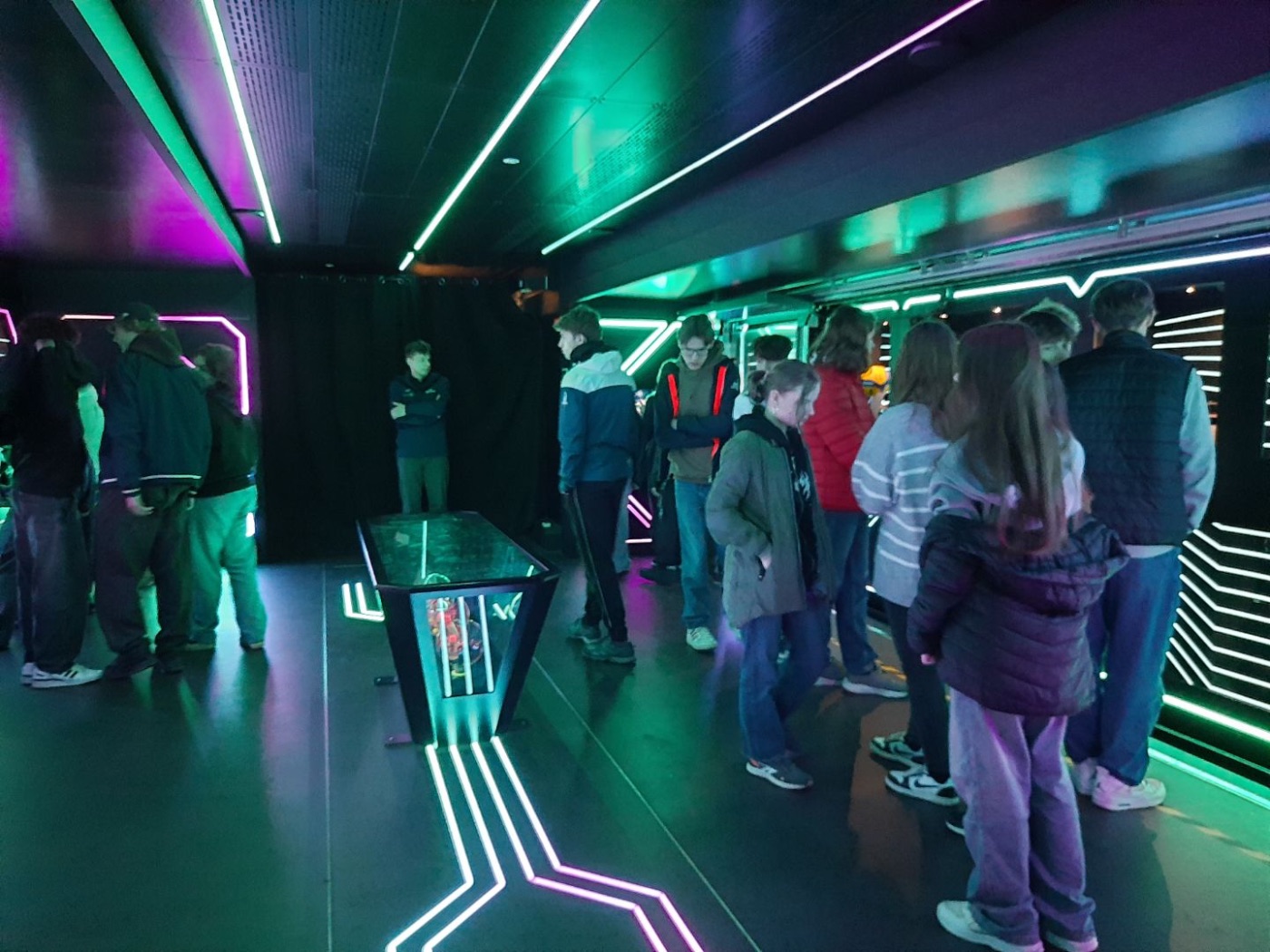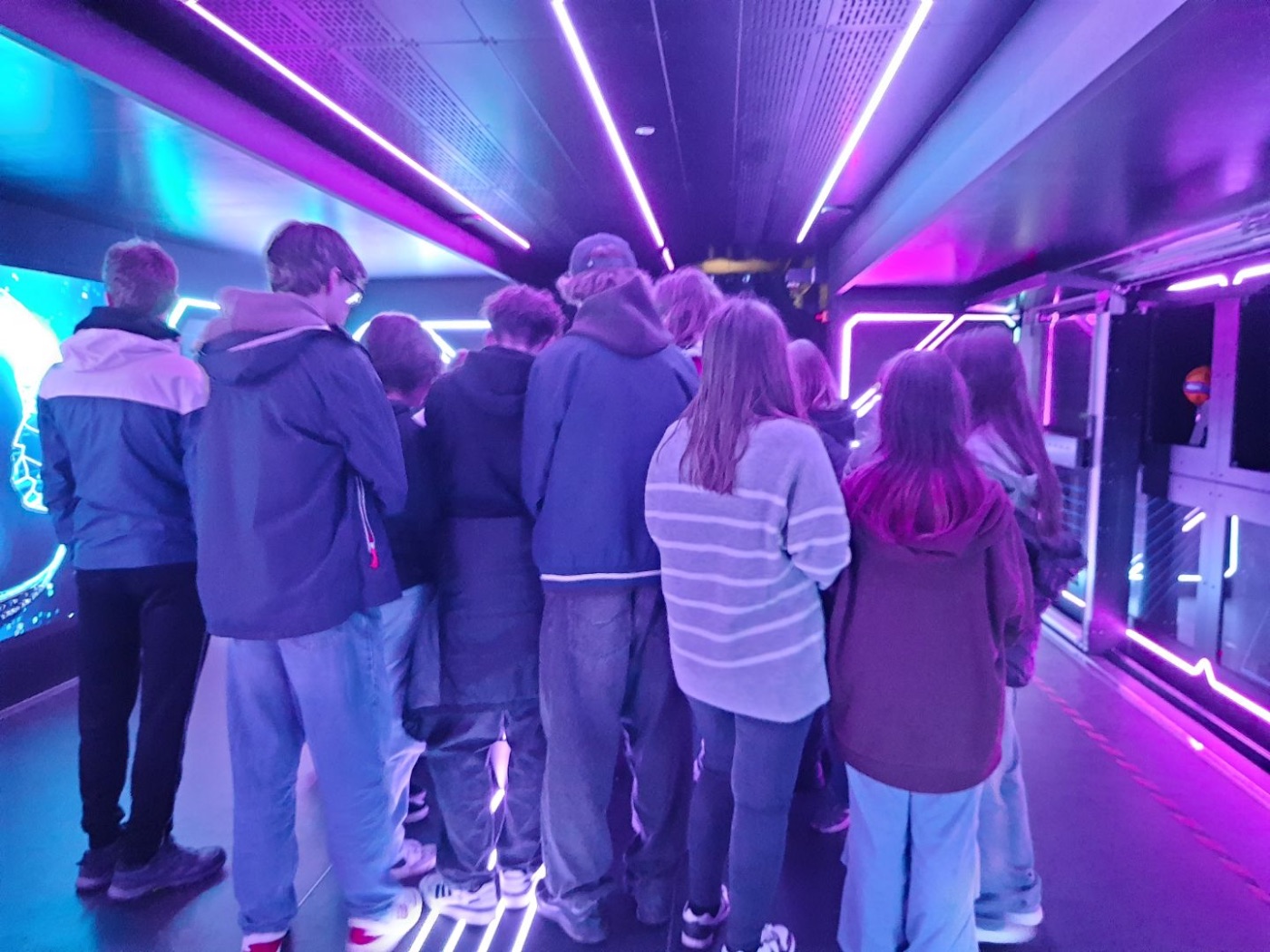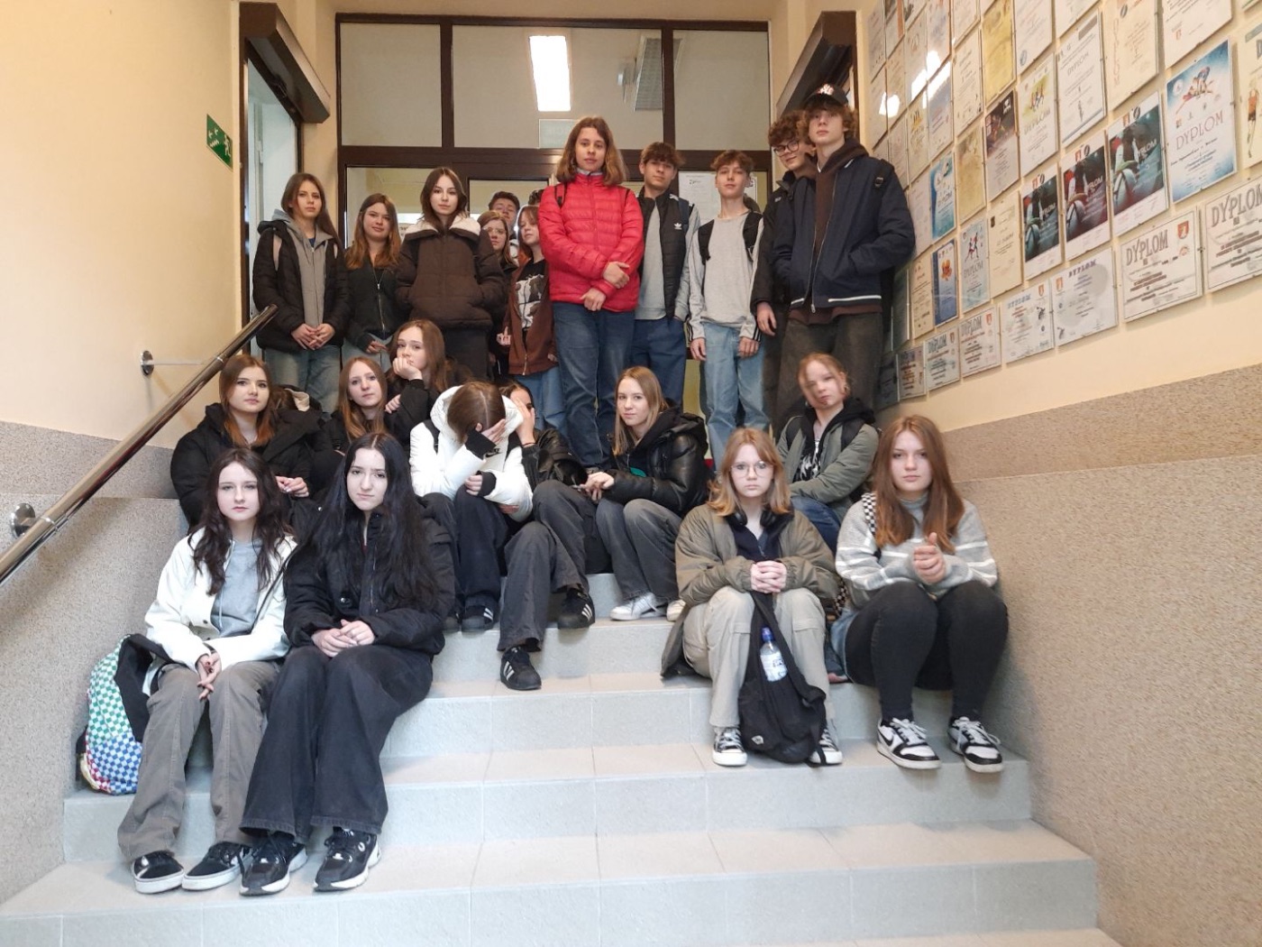 Uczniowie wraz z wychowawcą przeszli ze szkoły na parking przy Parku Miejskim w Skawinie. Czekał tam na nich ogromny tir „Niepodległej” – specjalna naczepa podróżująca po całej Polsce. Klasa obejrzała wyjątkową wystawę multimedialną w ramach immersyjnego pokazu o wybitnych Polkach i Polakach, którzy zmienili świat. Zastosowanie unikalnych rozwiązań technologicznych pozostawiło niezapomniane wrażenia. Technologia połączona z faktami i postaciami historycznymi, stworzyła opowieść o niepodległości Polski. Uczestnicy wycieczki poznali bohaterów tworzących naszą codzienność w różnych dziedzinach. Opowieść o niepodległości Polski przedstawia postać wykreowana przez AI i poruszająca się po ścianie na specjalnym ekranie.