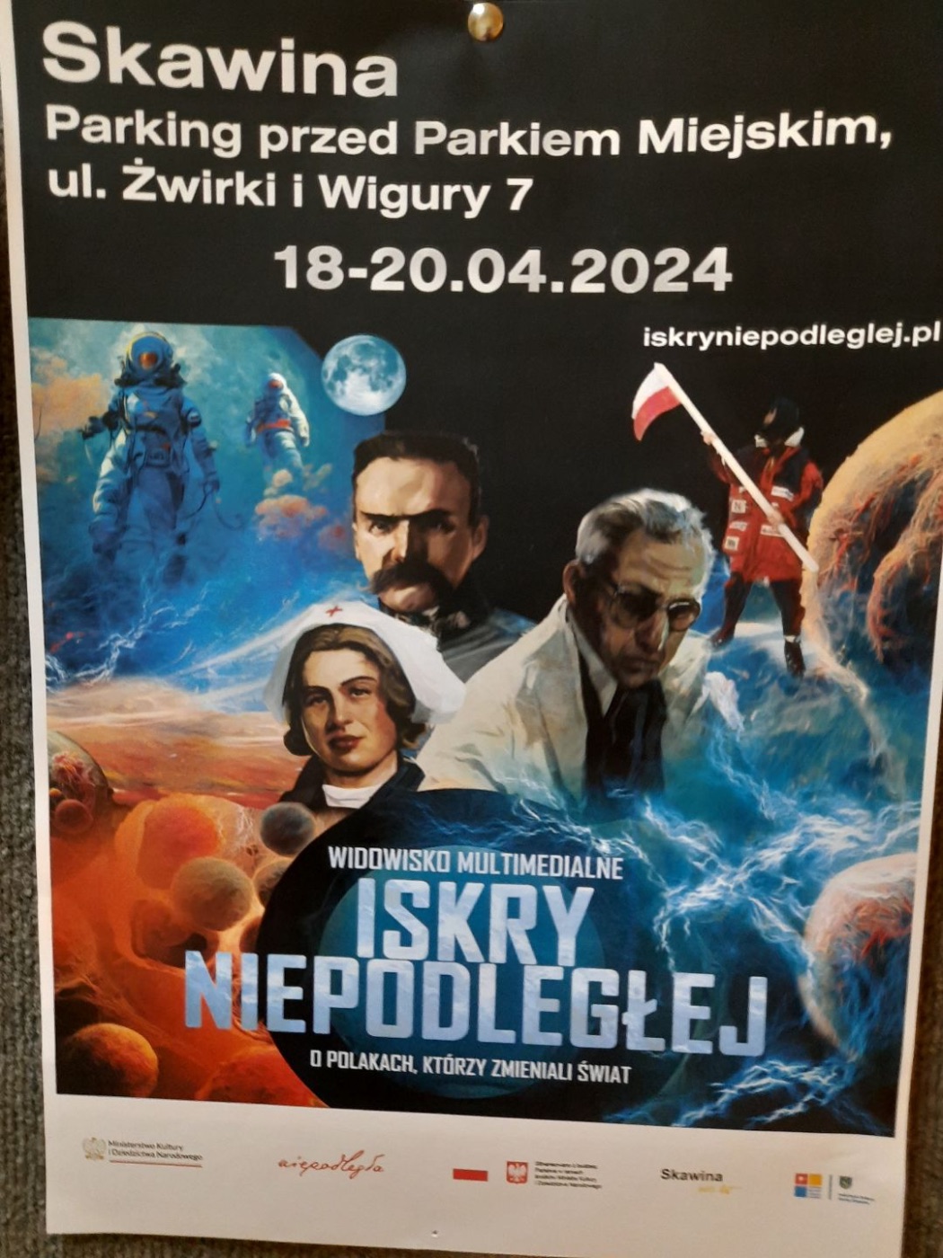 18 kwietnia 2024 r. klasa 1B na zaproszenie Centrum Kultury i Sportu w Skawinie udała się na wystawę „Iskry Niepodległej. Widowisko multimedialne o Polakach, którzy zmienili świat.”.