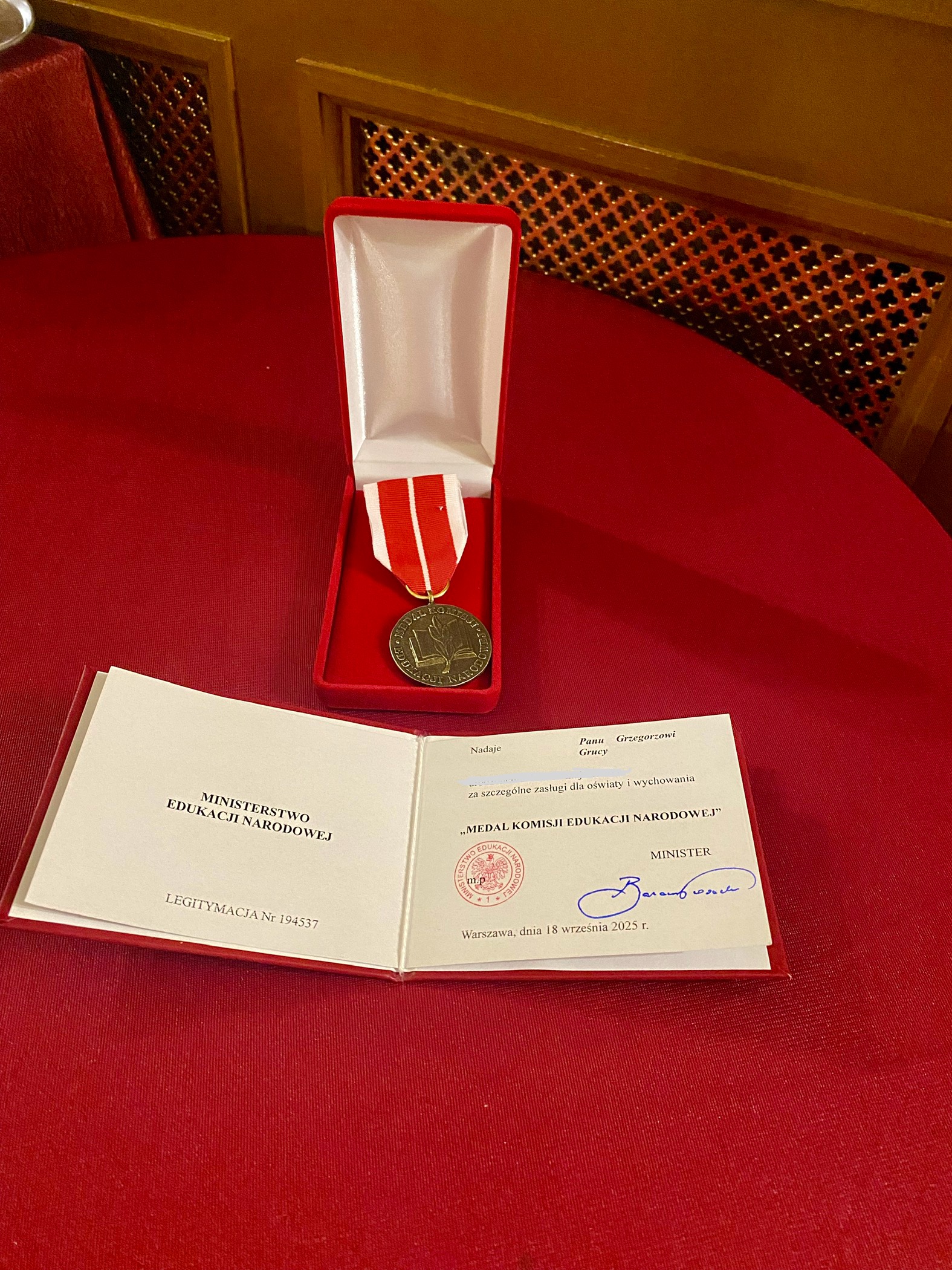 14 listopada nasz nauczyciel Grzegorz Gruca odebrał Medal Komisji Edukacji Narodowej, odznaczenie przyznawane za szczególne zasługi dla oświaty i wychowania przez Ministra Edukacji Narodowej. Medal wręczyła Małopolski Kurator Oświaty Pani Gabriela Olszowska podczas obchodów 120lecia Związku Nauczycielstwa Polskiego