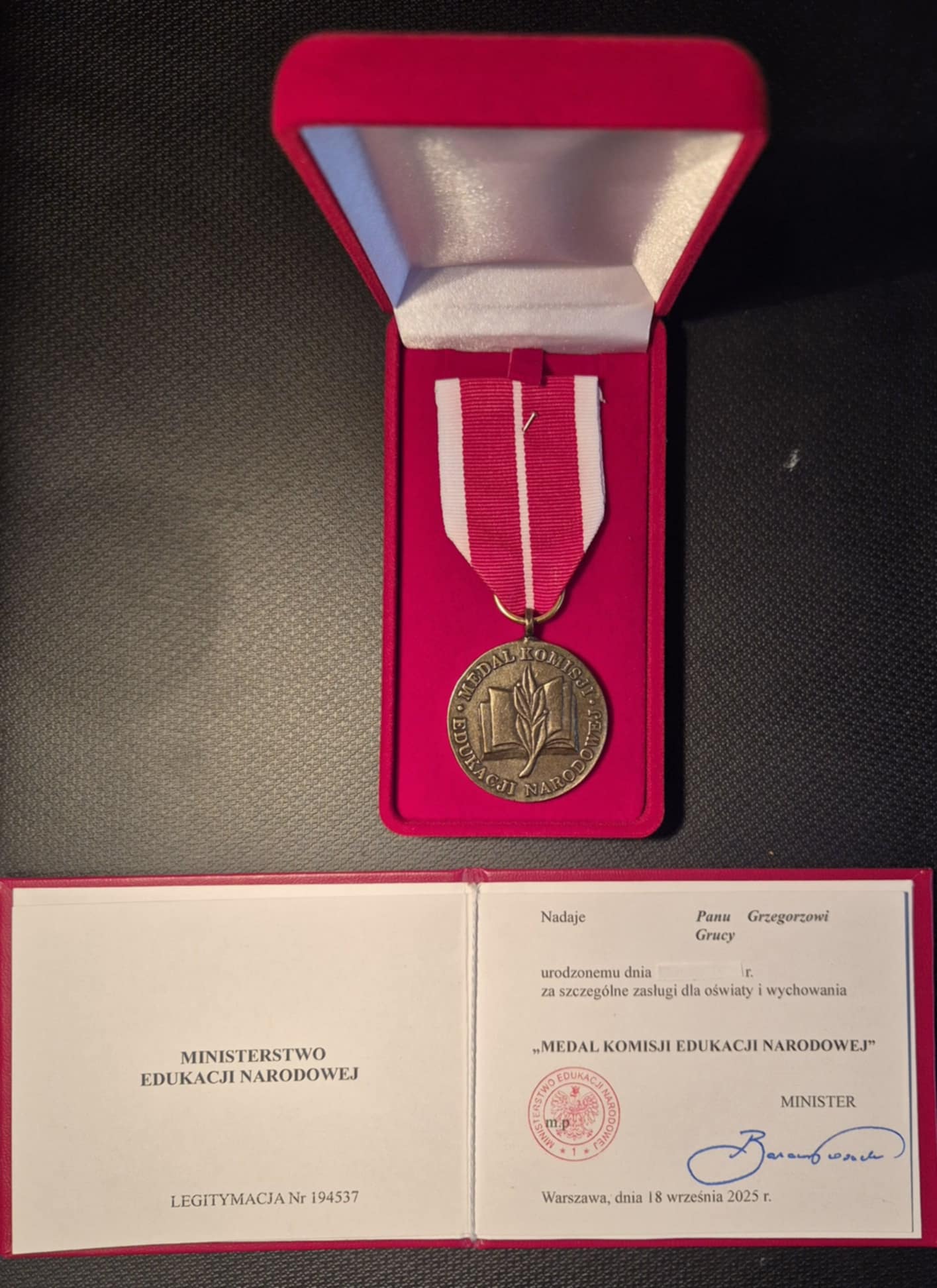 14 listopada nasz nauczyciel Grzegorz Gruca odebrał Medal Komisji Edukacji Narodowej, odznaczenie przyznawane za szczególne zasługi dla oświaty i wychowania przez Ministra Edukacji Narodowej. Medal wręczyła Małopolski Kurator Oświaty Pani Gabriela Olszowska podczas obchodów 120lecia Związku Nauczycielstwa Polskiego.